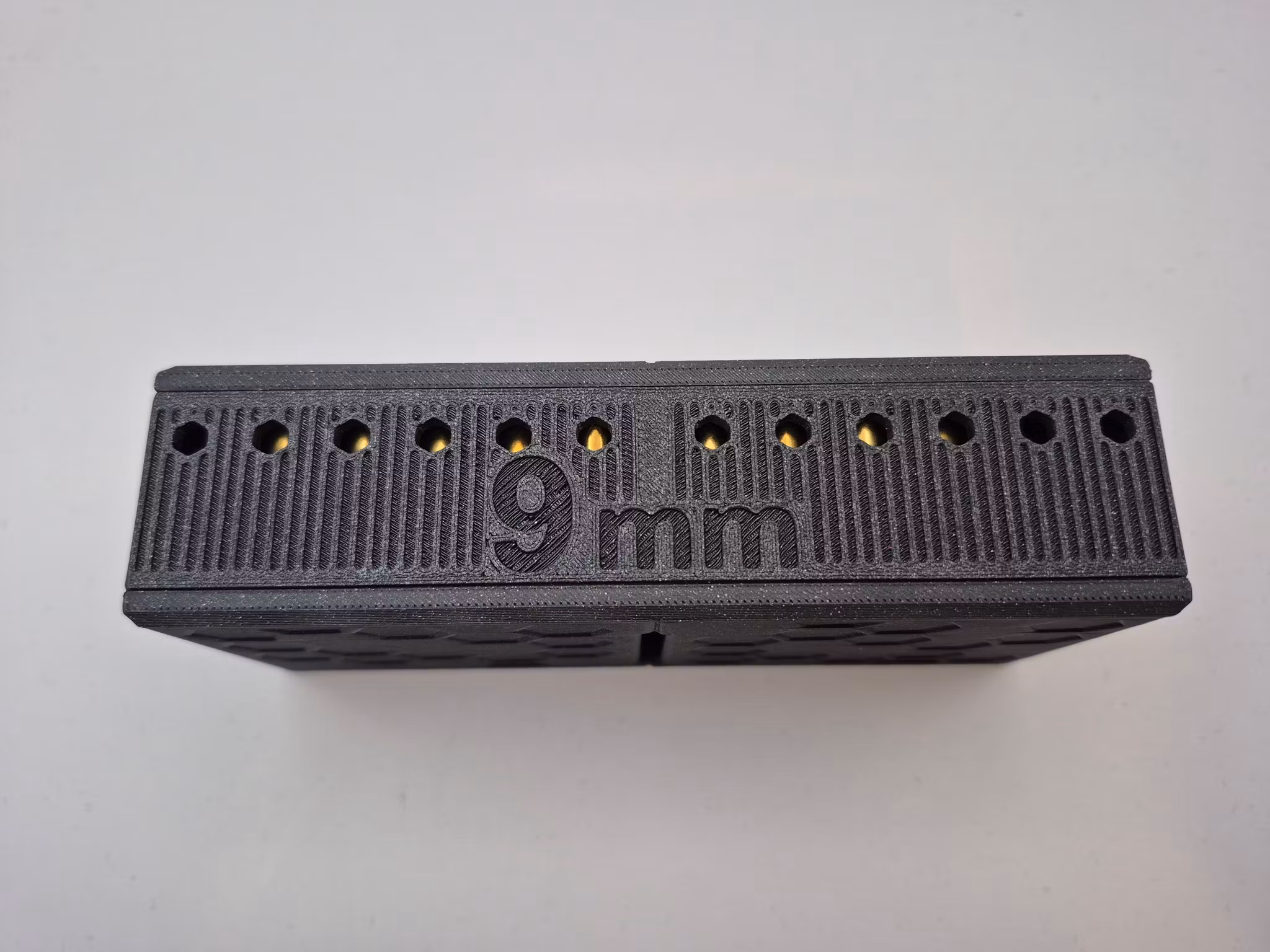 Genial patronboks for 9 mm til militærfelt. Patronene tømmes enkelt og samlet i hånden. Lett å fylle ved å slippe patronene ned med kulen først, slik at de legger seg pent. Lokket har et knepp for hvert kammer og hull så man kan se hvilke kammer som inneholder patroner.
